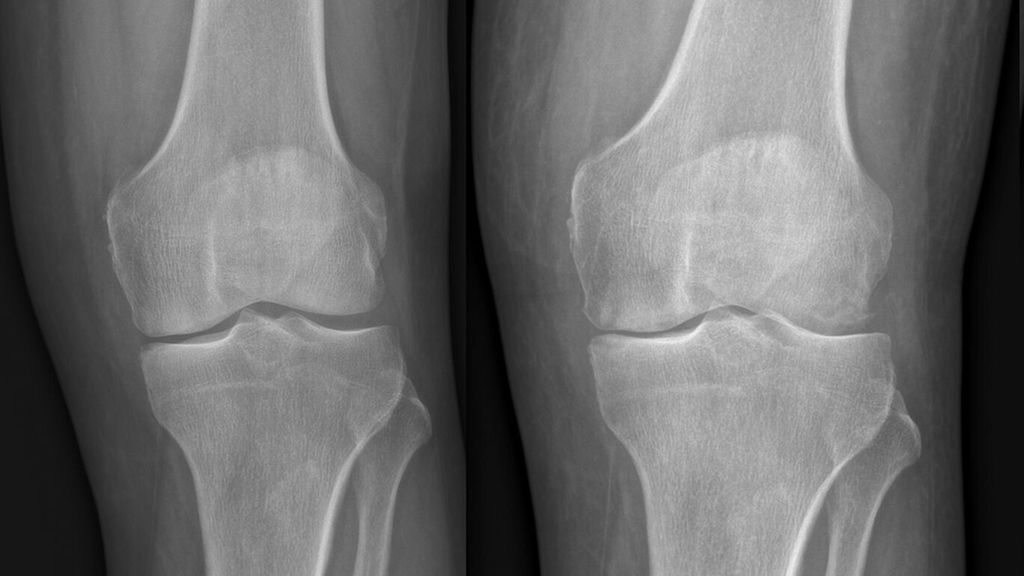 Abb. 1: Zunehmende Gelenksdestruktion mit subchondralen Osteolysen innerhalb weniger Wochen im Vergleich mit dem Vorbefund