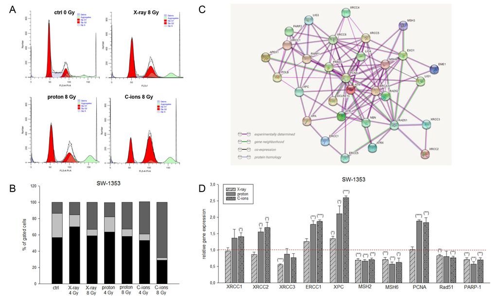 Abb. 3: Zelluläre und molekulare Modifikationen nach Partikelbestrahlung. A) Repräsentative Zellzyklusmessungen mittels Durchflusszytometrie. Es kommt zu einer deutlichen Arretierung der Chondrosarkomzellen in der G2/M-Phase. B) Verteilung der Zellzyklusphasen mit und ohne Bestrahlung. C)Netzwerkdarstellung der wichtigsten DNA-Reparaturgene. D) Genexpressionsanalysen wichtigster DNA-Reparaturgene nach Bestrahlung mit Photonen, Protonen und Kohlenstoffionen