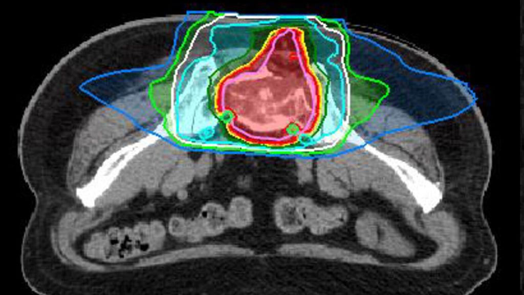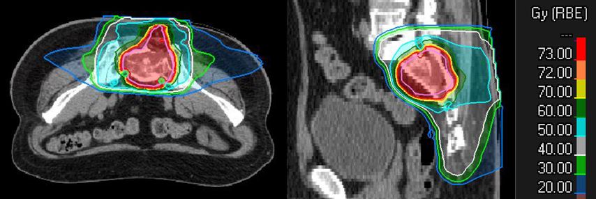 Abb. 2: Planbeispiel einer definitiven Behandlung eines Chordoms des Sakrums mit 16 Fraktionen à 4,6 Gy RBE pro Fraktion bis zu einer Gesamtdosis von 73,6 Gy RBE mit Kohlenstoffionen