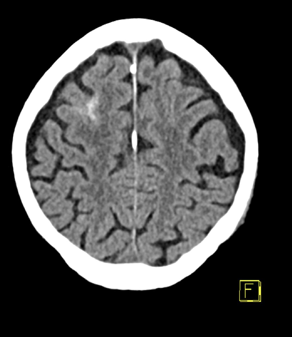 Abb. 1: 88-jähriger männlicher Patient erleidet unter der Einnahme von Rivaroxaban (Xarelto®) im Rahmen eines häuslichen Sturzes eine Subarachnoidalblutung rechts frontal