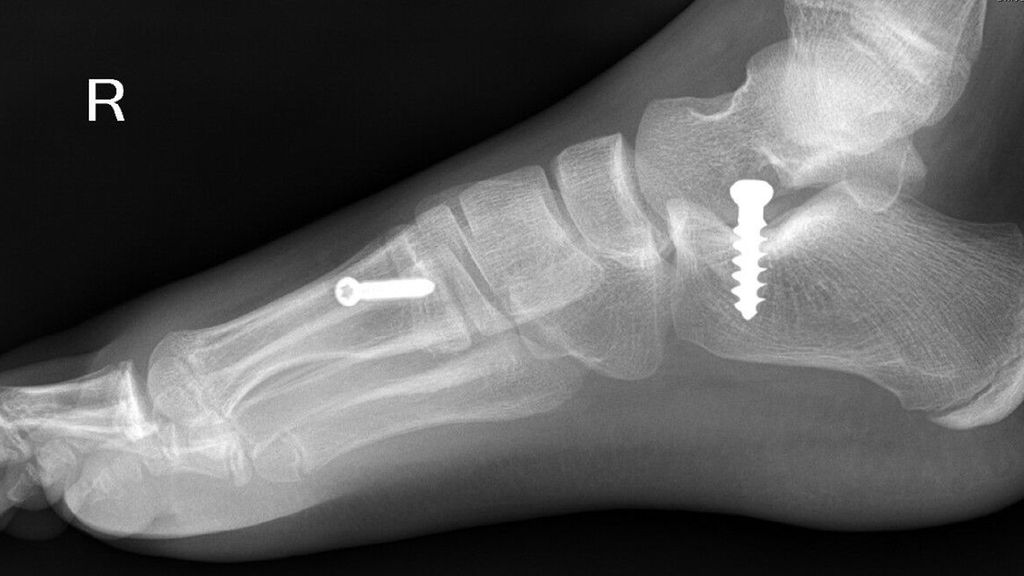 Verbleibende Valgusfehlstellungen im oberen Sprunggelenk über das 8. bis 10. Lebensjahr hinaus bedingen einen Knickfuß bzw. Rückfußvalgus, welcher in Kombination, aber auch ohne gleichzeitig vorhandenen Senkfuß bestehen kann. Dieser Rückfußvalgus lässt sich mit einer medialen Schraubenepiphyseodese am Innenknöchel gut korrigieren (Abb. 10), welche im Falle eines gleichzeitig vorhandenen abgeflachten Längsgewölbes mit einer Arthrorise (z.B. mit Calcaneus-Stopp-Schraube) kombiniert werden kann. Es wurde in zahlreichen Publikationen gezeigt, dass diese einen wachstumslenkenden Effekt auf die Plattfußdeformität hat, welcher auch nach Entfernung der Stopp-Schraube (routinemäßig nach etwa drei Jahren) verbleibt (Abb. 11).