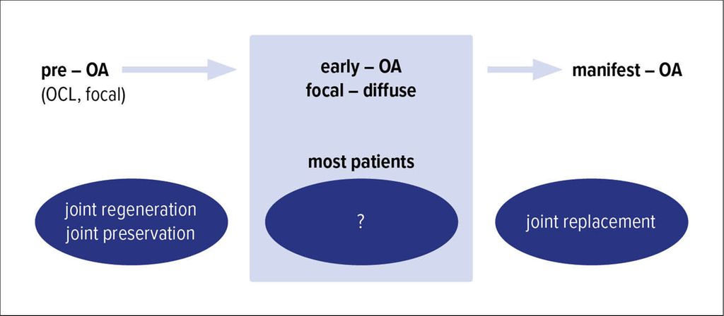 Wenn somit klassisch regenerative Methoden bei Früharthrose ungeeignet scheinen, bleibt zu fragen, wie Patienten in diesem Arthrosestadium zu behandeln sind (Abb. 1).