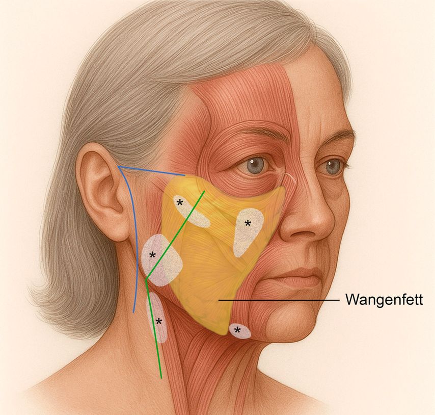Eine natürliche Verjüngung der Wange erfordert die ausgedehnte Mobilisation und Reposition des abgesunkenen Wangenfettgewebes in seine ursprüngliche anatomische Position.