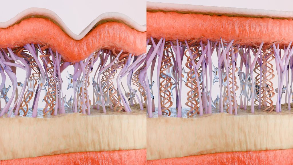 Kollagen und Elastin: Kollagen sorgt für die Festigkeit der Haut, während Elastin die elastischen Eigenschaften beisteuert. Im normalen Alterungsprozess und unter Einfluss von UV-Strahlung oder freien Radikalen nimmt die Kollagenproduktion ab und das Elastin wird abgebaut, was zu Falten und Verlust der Hautelastizität führt.