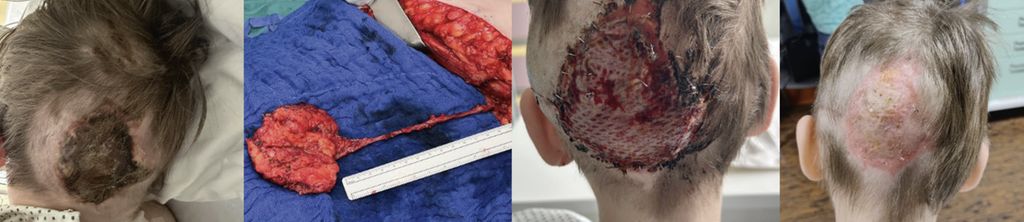 Abb. 1: Patient 1: Nekrose im Bereich des Hinterkopfes. Defektdeckung mittels freier Serratus-anterior-Lappenplastik, anastomosiert an die A. temporalis superficialis, sowie zusätzlicher Spalthauttransplantation