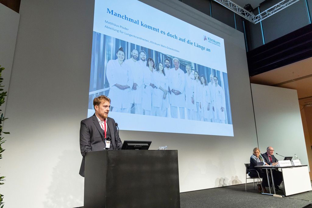 Das vermutlich beliebteste und daher bestbesuchte Format der Jahrestagung war, ist und bleibt die „FalldesJahres“-Session. Gleich am ersten Tag präsentierten 14 Jungmediziner:innen ihre zum Teil haarsträubenden Patient:innenfälle. Während letztes Jahr noch eine beunruhigende Anzahl von aspirierten zahnärztlichen Heilbehelfen zu Präsentationen im Rahmen dieses Formats führte, gab es dieses Jahr einen klaren Trend zu seltenen Erkrankungen. Solch eine „orphan disease“ wurde auch gleich zu Beginn der Session von Dr. Matthäus Ploder, Wels-Grieskirchen, in „Manchmal kommt es doch auf die Länge an“ vorgestellt (Abb. 3). Ploder konnte mit seiner schnellen, aber präzisen Vortragsweise die höchste von den Anwesenden vergebene Punktezahl und somit den 1. Platz für sich gewinnen. Was es mit der von ihm besprochenen Länge auf sich hat, werden Sie im Detail in der nächsten Ausgabe von JATROS Pneumologie & HNO nachlesen können. Platz 2 ging an den nicht minder unterhaltsamen Vortrag von Dr. Tibor Krajc, Wien, der seinen Fall des Jahres mit dem Titel „Tale of the Legionnaires’ Twist (Stridor aus der Tiefe! Spontane Lungentorsion)“ in sich reimenden Versen vortrug. Ein Vorgehen, das die Latte für die Präsentationen 2024 noch ein Stück höher legen wird. Dr. Katharina Kostenzer, Natters, konnte mit „Es ist nicht so, wie es scheint“ den 3. Platz für sich beanspruchen. Die hohe PD-L1-Expression des mittels Bronchoskopie gewonnenen Probenmaterials der von ihr vorgestellten Patientin deutete auf einen Tumor hin. Im weiteren Verlauf kam es dann zur Erkenntnis, dass die Ursache des Übels eine Tularämie war.