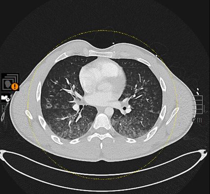 Mittels Pulmonalisangiografie-CT konnte eine Pulmonalembolie ausgeschlossen werden, dafür zeigten sich diffuse und ubiquitär verteilte alveoläre Konsolidierungen (Abb. 1). Eine ältere Bildgebung zum Vergleich lag nicht vor. In Anbetracht der bildmorphologischen Veränderungen wurde unter anderem die Verdachtsdiagnose einer Vaskulitis gestellt.