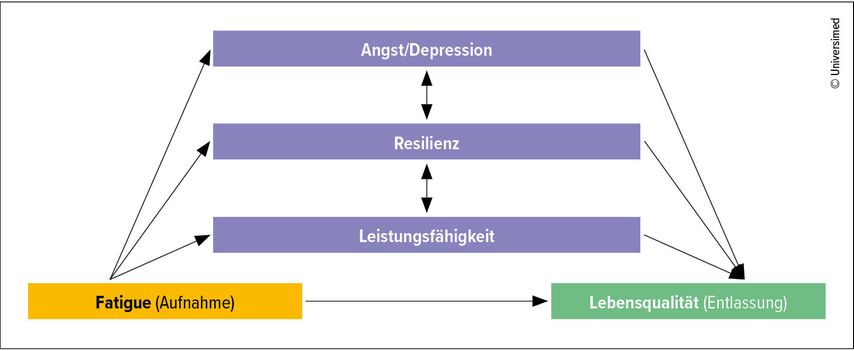 In explorativen Vorhersagemodellen zeigen wir: Die Fatigue zu Reha-Beginn, gemeinsam mit den Veränderungen in Angst/Depression, Resilienz und körperlicher Leistung, erklärt einen wesentlichen Anteil der Lebensqualität bei Entlassung (Abb.2). Es handelt sich also um ein multifaktorielles, biopsychosoziales Energiemanagement-Problem, das auch psychologische Komponenten umfasst und integrativ adressiert werden muss. Daraus folgt: Multimodale Programme, die Rekonditionierung, Pacing/Energiemanagement und psychologische Unterstützung verbinden, sind notwendig – um funktionelle Gewinne in spürbare Lebensqualität zu übersetzen.