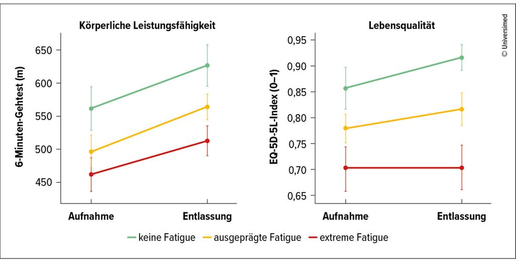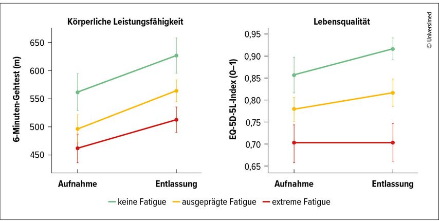 Die Patient:innen zeigten bei Aufnahme im Mittel eine ausgeprägte Fatigue. Obwohl sich alle Zielparameter signifikant verbesserten, waren die Effekte höchst unterschiedlich: Die größte Verbesserung wurde im 6MWT verzeichnet, dessen Distanz im Mittel um 12% zunahm (großer Effekt). Die Reduktion der Fatigue (FAS) fiel mit durchschnittlich 7% und der Zugewinn im EQ-5D-5L-Index (QoL) mit durchschnittlich 4% nur moderat aus. Auffällig: Rund 81% der Patient:innen berichteten bei Entlassung weiterhin über eine ausgeprägte oder extreme Fatigue.