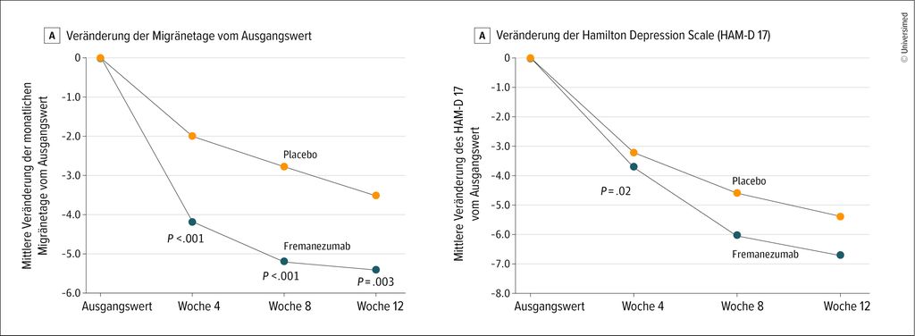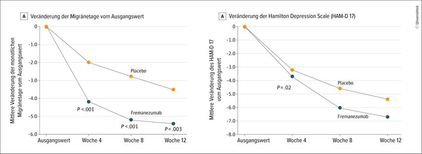 Abb. 2: Wirkung von Anti-CGRP-Antikörpertherapien bei Migräne und Depression. Modifiziert nach Lipton RB et al.: JAMA Neurol 2025; 82(6): 560-569