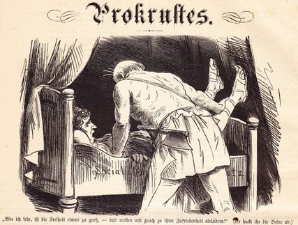 Aber wie kommt Prokrustes nun bei der Gesundheitsreform ins Spiel? Prokrustes war ein mythologischer Wegelagerer, ein riesiger Sohn des Poseidon, der einsame Wanderer zu sich in die Hütte einlud und ihnen dort ein Bett anbot. Waren sie zu groß für das Bett, „hackerte“ (Achtung! Wortspiel!) er ihnen die Extremitäten ab. Waren sie zu klein, legte er sie auf einen Amboss und schmiedete sie, bis sie das richtige Format hatten. Der Körper des Gastes musste in das Format des Bettes passen – das war das Ziel.