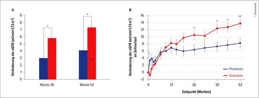 Abb. 1: ADVOCATE: Entwicklung der geschätzten glomerulären Filtrationsrate (eGFR) im Zeitverlauf; * = signifikant, ** = hochsignifikant (modifiziert nach Jayne DRW et al. 2021)14