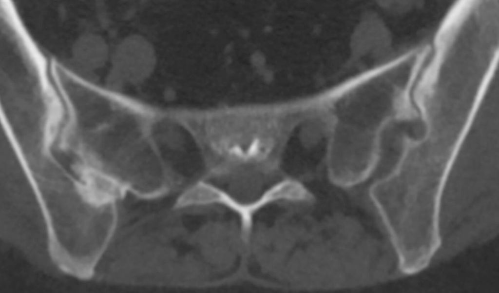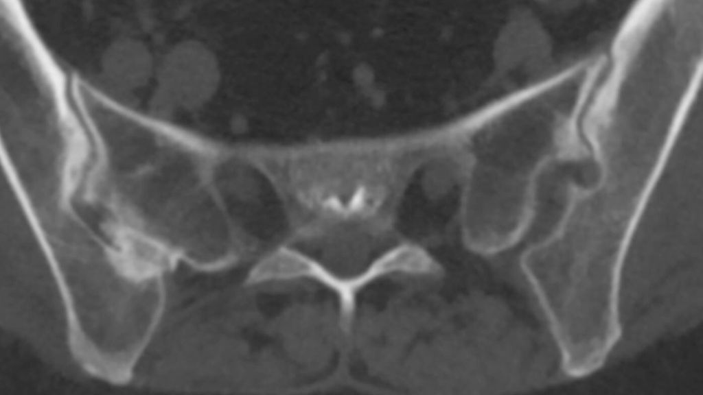 Abb. 2: Computertomografie: überlagerungsfreie CT-Darstellung der knöchernen Veränderungen an den Sakroiliakalgelenken mit Sklerosierungen, Erosionen und Ankylosen