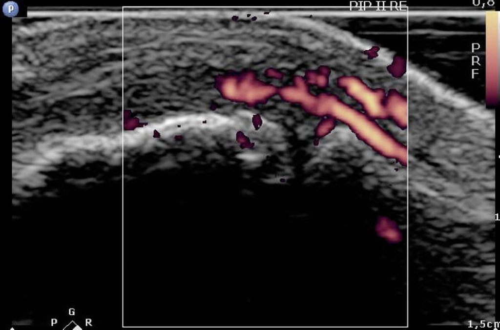 Abb. 4: Sonografie des PIP II bei Erstvorstellung einer Patientin mit akuten Beschwerden in den Fingergelenken. Es zeigt sich eine deutliche synoviale Hyperämie in der Power-Doppler-Sonografie als Ausdruck einer Synovitis bei noch negativem Röntgenbefund. Man beachte die hohe räumliche Auflösung dieser Bildgebung!