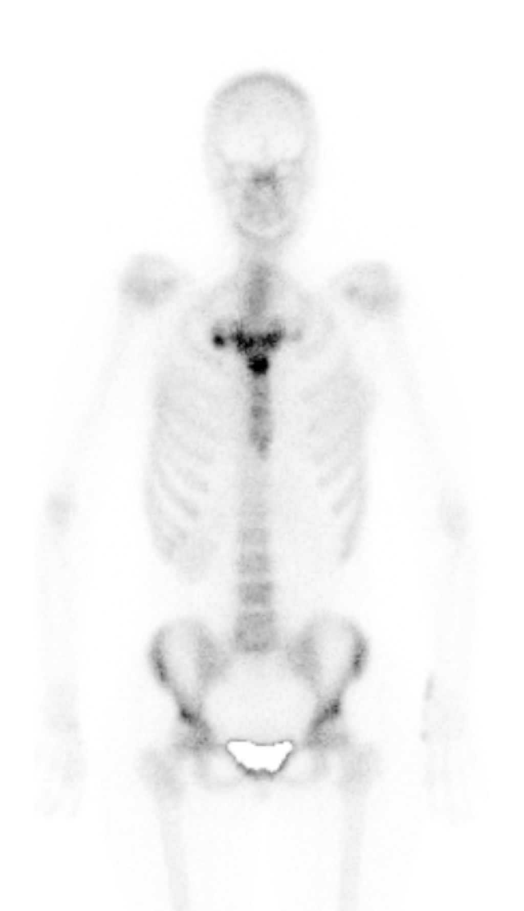 Abb. 5: Skelettszintigrafie mit deutlicher Tracer-Anreicherung im sternocostoclavikulären Übergangsbereich
