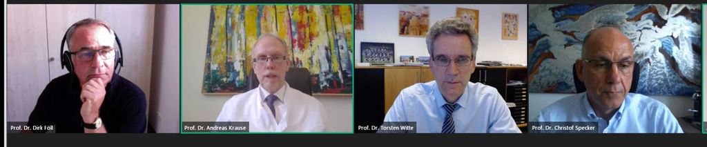 Online-Pressekonferenz zum 50. Kongress der DGRh in Berlin (v. li. n. re.: Prof. Dirk Föll, Prof. Andreas Krause, Prof. Torsten Witte, Prof. Christof Specker)