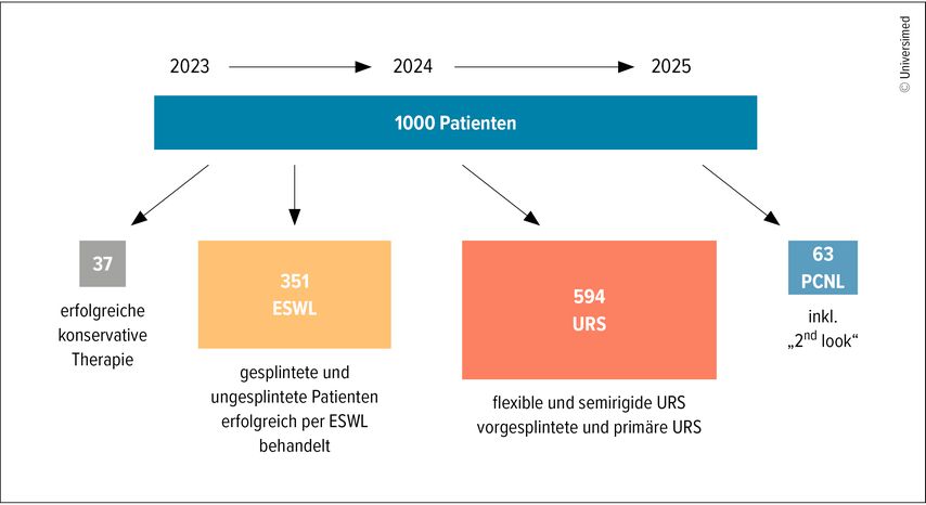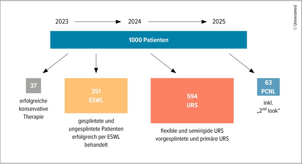 Die aktuelle Situation an einem modernen Steinzentrum zeigt sich gut an den Zahlen, wie sie sich derzeit in der Steinklinik Ottakring präsentieren. Im Zeitraum vom 1.1.2023 bis 31.12.2025, also innerhalb von drei vollen Kalenderjahren, haben wir für die folgende Analyse 1000 konsekutive Patienten mit einer symptomatischen Nephrolithiasis betrachtet (Abb.1). Darunter verstehen wir in diesem Zusammenhang ein Steinleiden, das für Symptome wie Koliken, Hämaturie oder eine Stauung der Harnwege verantwortlich ist, die vom rezidivierenden Harnwegsinfekt bis hin zur Urosepsis reichen kann. Wir haben in diesem Zeitraum natürlich wesentlich mehr Patienten im Steinzentrum gesehen und behandelt, die Steine als Begleiterkrankung hatten, diese bedurften aber zu diesem Zeitpunkt keiner weiterführenden Therapie in diesem Zusammenhang.