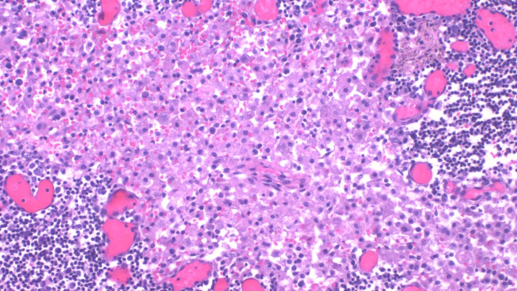 Die definitive Diagnosestellung erfolgte mittels Knochenbiopsie der proximalen Tibia. Eine diagnostische Herausforderung dabei ist, dass die meisten Zellen in den Läsionen oft nicht charakteristische ECD-Zellen, sondern reaktive Entzündungszellen sind. Die histologische Untersuchung zeigte eine Proliferation histiozytärer Zellen mit charakteristischem immunhistochemischem Profil: CD1a-negativ, CD68-positiv. Die molekularpathologische Analyse wies eine BRAFV600E-Mutation mit niedriger Allelfrequenz von 1,91% nach. Diese BRAFV600E-Mutation ist pathognomonisch und findet sich bei etwa der Hälfte aller ECD-Patienten.