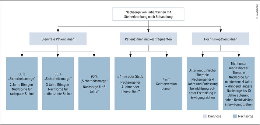 Patient:innen ohne Risikofaktoren mit schattenden Steinen, die postinterventionell steinfrei sind, sollten nach 6, 12 und 24 Monaten mittels Sonografie nachkontrolliert werden und können danach mit 80-prozentiger Steinfreiheitswahrscheinlichkeit aus der Observanz entlassen werden.
