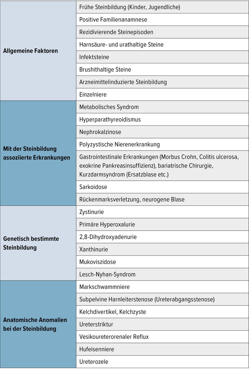 Tab. 1: Hochrisikogruppe der Harnsteinpatient:innen (nach S2k-Leitlinie zur Diagnostik, Therapie und Metaphylaxe der Urolithiasis und EAU-Leitlinie zur Urolithiasis)