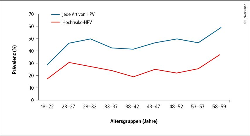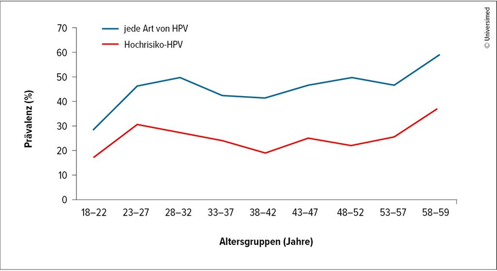 Epidemiologische Daten belegen ein unterschiedliches Infektionsmuster bei Männern. Ab dem dritten Lebensjahrzehnt liegt die Prävalenz von HPV-Infektionen im Gegensatz zu Frauen bei konstant weit über 30%. Ein wichtiges Detail ist, dass die Übertragung von Frau auf Mann deutlich besser funktioniert als umgekehrt. Die Zahlen widerlegen außerdem klar die Vorstellung, dass HPV nur eine Infektion des Jugendalters ist und daher eine späte Impfung keinen Sinn macht. Doch wie kann man sich eine HPV-Erkrankung beim Mann vorstellen? Während Genitalwarzen medizinisch eher harmlos sind, ist das onkologische Risiko deutlich alarmierender. HPV verursacht unter anderem Peniskarzinome, Analkarzinome, oropharyngeale Karzinome – vor allem HPV-16-assoziiert – und möglicherweise HPV-assoziierte Urothelkarzinome. Besonders dramatisch ist die epidemiologische Entwicklung der oropharyngealen Karzinome: In mehreren Ländern hat die HPV-assoziierte Inzidenz dieser Tumoren bei Männern bereits jene des Zervixkarzinoms bei Frauen überholt. Der Altersgipfel der Karzinome beim Mann liegt um das 65. Lebensjahr (im Gegensatz zum Zervixkarzinom, das seinen Altersgipfel mit 45 Jahren hat).