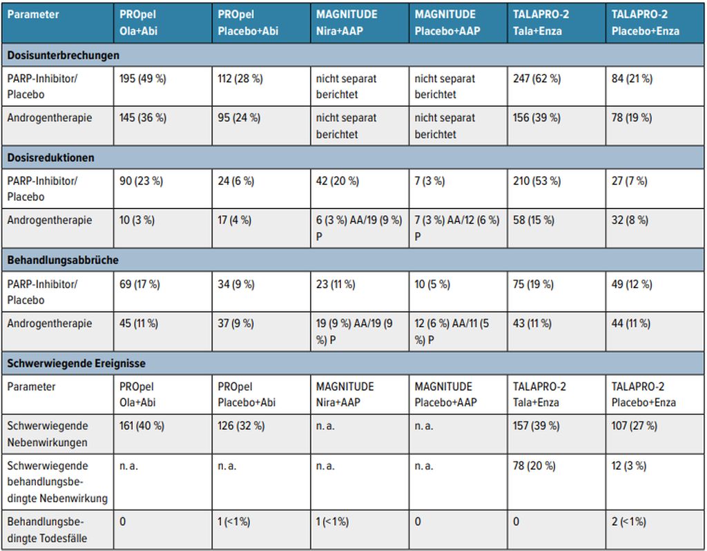 Tab. 4: Dosismanagement, Behandlungsabbrüche, schwerwiegende Ereignisse in den Phase-III-Studien für Inhibitoren der Poly(ADP-Ribose)-Polymerasen (PARPi) und des Androgenrezeptor-Signalweges (ARPi) für die Therapie des metastasierten kastrationsresistenten Prostatakarzinoms. Abkürzungen: Ola = Olaparib, Abi = Abirateron, Nira = Niraparib, AAP = Abirateronacetat + Prednison, AA= Abirateronacetat, P = Prednison, Tala = Talazoparib, Enza = Enzalutamid, n.a. = nicht angegeben