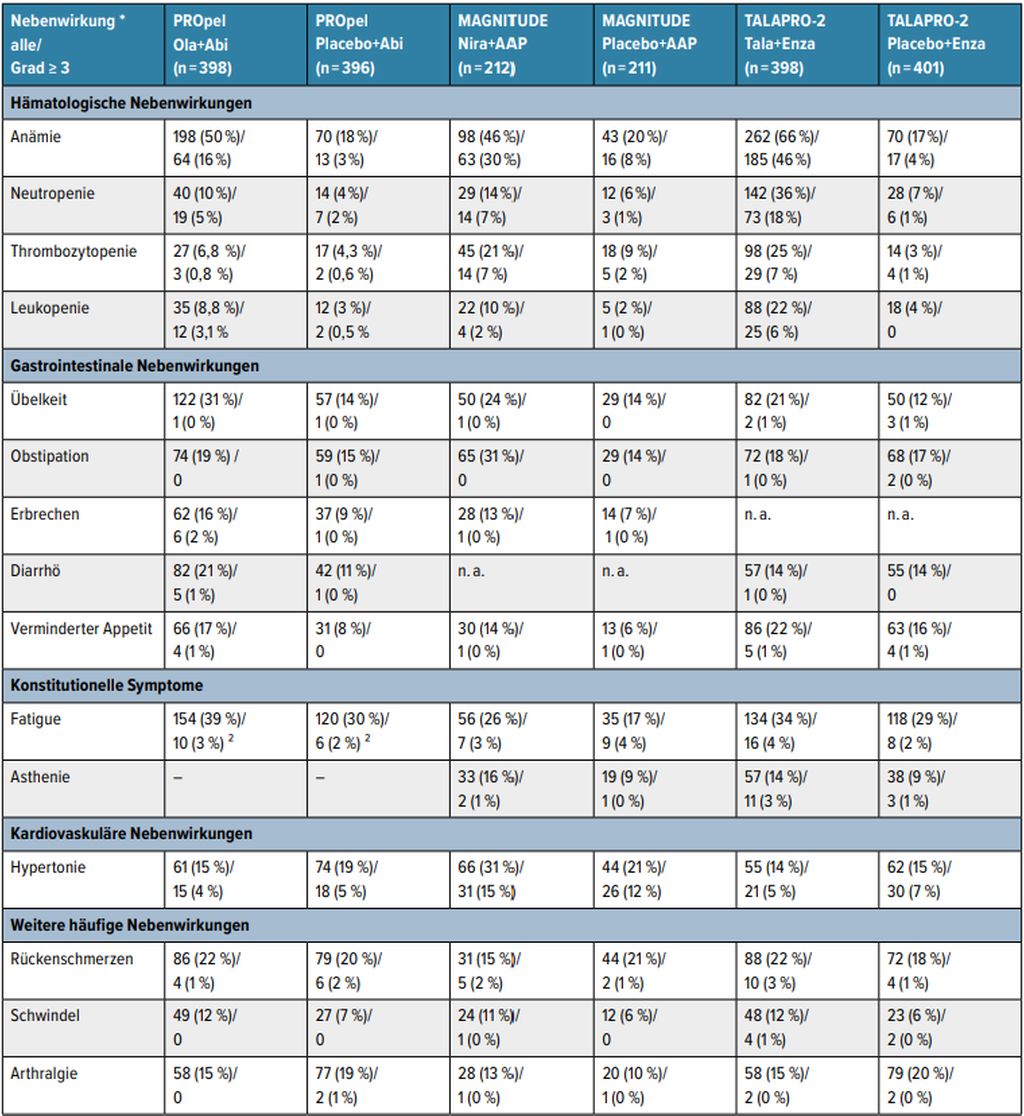 Basierend auf den veröffentlichten Daten der PROpel-Studie waren die häufigsten Nebenwirkungen aller Grade hämatologische Ereignisse, insbesondere Anämie, die bei 50% der Patienten auftrat. Zudem traten häufiger Fatigue (39% vs. 30%), Übelkeit (31% vs. 14%) und Diarrhö (21% vs. 11%) auf, wobei die Grad-3–4-Ereignisse deutlich seltener waren (Anämie 16% vs. 3%, Fatigue 3% vs. 2%). Das Risiko für venöse Thromboembolien war erhöht, mit einer Inzidenz von 9% vs. 4%. Die Rate an Abbrüchen der Therapie mit Olaparib oder Placebo aufgrund von Nebenwirkungen lag bei 17% vs. 9%. Die Rate der Abbrüche der Abiraterontherapie lag bei 11% vs. 9%.5