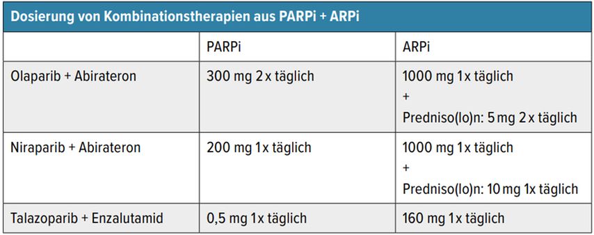 Tab. 2: Dosierung von Kombinationstherapien aus PARPi(Poly[ADP-Ribose]-Polymerase-Inhibitoren) und ARPi (Inhibitoren des Androgenrezeptorsignalweges) beim mCRPC (metastasiertes kastrationsrefraktäres Prostatakarzinom)