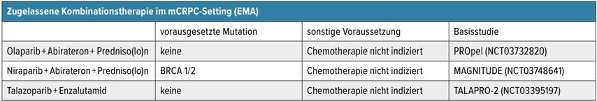 Tab. 1: Aktuell zugelassene Poly(Adenosin-Diphosphat-Ribose)-Inhibitoren(PARPi)- und Androgenrezeptor-Signalweg-Inhibitoren(ARPi)-Kombinationen in Europa