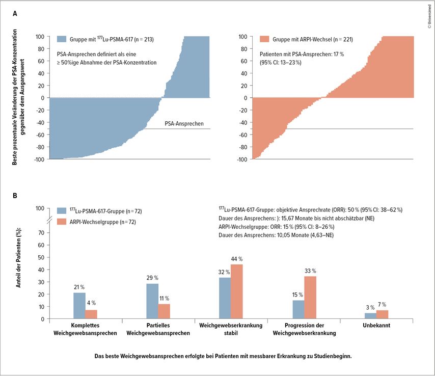 Abb. 1: In der PSMAfore-Studie führte eine Therapie mit 177Lu-PSMA-617 zu einer höheren PSA-Ansprechrate (51 % vs. 17 %) und verlängerte das radiologische progressionsfreie Überleben (9,3 Monate vs. 5,5 Monate) im Vergleich zu einem Wechsel des Androgenrezeptor-Pathway-Inhibitors. PSA-Ansprechen wurde definiert als eine ≥ 50%ige Abnahme der PSA-Konzentration (übersetzt, sonst unverändert übernommen aus Morris MJ et al. 2024)2