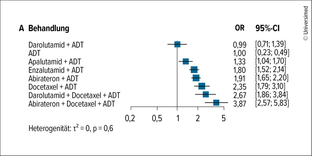 Auch für das OS zeigten die meisten Kombinationstherapien einen signifikanten Vorteil gegenüber der ADT-Monotherapie (Abb.2). Für Darolutamid in Kombination mit ADT konnte jedoch kein statistisch gesicherter OS-Vorteil nachgewiesen werden. Dieser Befund ist vor dem Hintergrund zu interpretieren, dass das Gesamtüberleben kein primärer Endpunkt der ARANOTE-Studie war und die Studie nicht auf eine entsprechende statistische Aussagekraft ausgelegt war.