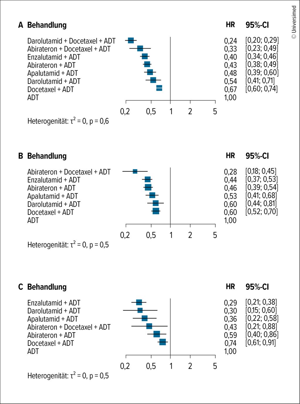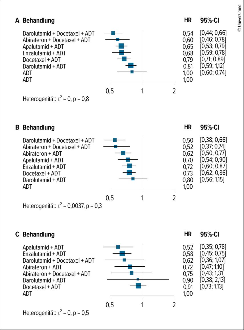 Abb. 1: Hazard-Ratios (HR) für das progressionsfreie Überleben (PFS) aus einer Netzwerk-Metaanalyse mit Zufallseffekten im Vergleich zu ADT.