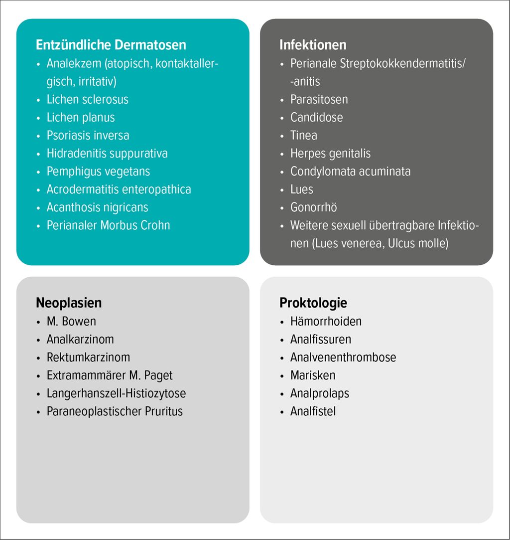 Infektiöse Krankheitsbilder: Hierzu zählen bakterielle Infektionen (z.B. perianale Streptokokkendermatitis), Pilzinfektionen (Candidose, Tinea), virale Erkrankungen (Herpes simplex, Condylomata acuminata), sexuell übertragbare Erkrankungen (z.B. Lues, Gonorrhö) sowie parasitäre Infektionen (z.B. Oxyuriasis).1,3