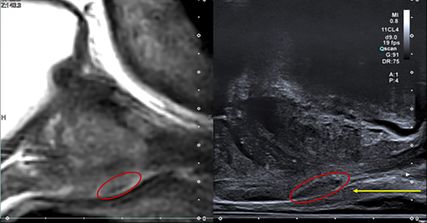 Abb. 1: MRT (links) und Ultraschall (rechts) der Prostata im sagittalen Anschnitt mit suspektem Areal (roter Kreis) in der apikalen Peripherenzone. Der gelbe Pfeil stellt den perinealen Punktionsweg der Biopsienadel dar
