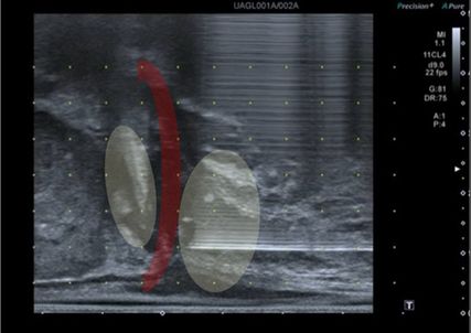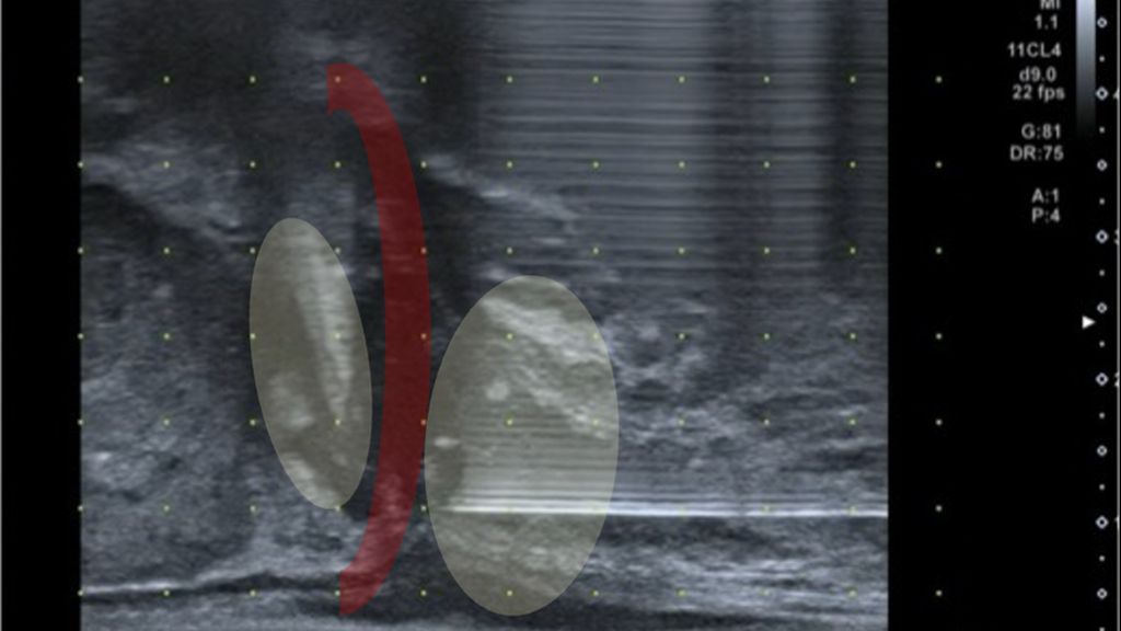 Abb. 2: Sonografische Darstellung der tiefen Beckenbodenmuskulatur (rot) und der Prostataapex. In Gelb dargestellt sind die Applikationsorte der tiefen Lokalanästhesie vor perinealer Prostatabiopsie