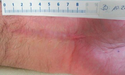 Abb. 1: Zustand nach palmarer Radiusverplattung mit hypertropher Narbe 11 Monate postoperativ