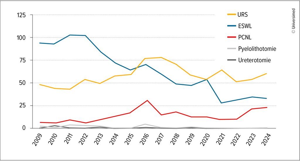 In entwickelten Ländern beträgt die Inzidenz von Harnsteinen bei unter 18-Jährigen etwa 1/10 bis 1/100 derer von Erwachsenen (8–75/100000 vs. 900–2100/100000). Die Häufigkeit nimmt bei Jugendlichen zu, und hier vorwiegend bei Mädchen. Steine vor der Pubertät sind selten.1,2 Die Abbildung 1 zeigt die überschaubare Zahl an therapeutischen Interventionen bei Kindern und Jugendlichen in Österreich von 2009 bis 2024.