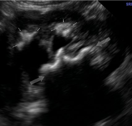 Abb. 2: 3-jähriges Mädchen, Ultraschall der linken Niere mit der – nach unserer Erfahrung vergleichsweise seltenen – Kombination aus Stein (Blockpfeile) mit Schallschatten und Nephrokalzinose (schlanke Pfeile), hier wegen der Hydronephrose gut zu unterscheiden. Klinisch und laborchemisch wurde am Lebensanfang eine infantile Hyperkalziämie mit Hyperkalziurie und erniedrigtem Parathormon diagnostiziert. Die Genetik ergab aber keine dahingehend bekannte Mutation