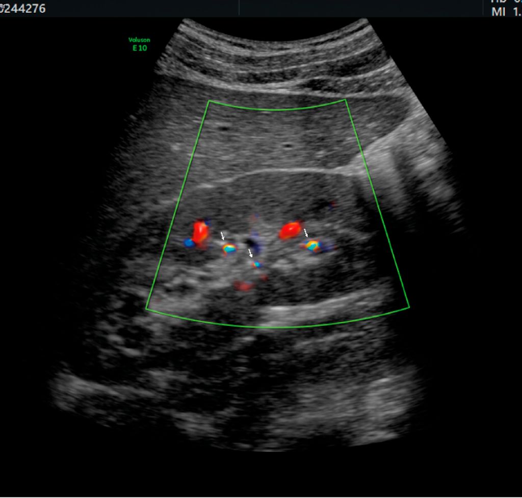 Abb. 3: Rechte Niere eines 16-Jährigen mit Zystinurie. Nach flexiURS am Vortag sieht man kleinste Residualkonkremente nur mithilfe des bunten Twinkling-Artefakts im Doppler. Tricks für gutes Twinkling: niederfrequenter Schallkopf, niedrige Dopplerfrequenz. Und: PRF (Puls-Repetitions-Frequenz) hochdrehen, um das bunte „aliasing“ der Blutgefäße zu beseitigen