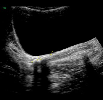 Abb. 4: Verkalkte Deflux®-Depots. Ein häufiges Bild einige Jahre nach Ostium-Unterspritzung, sonografisch von einem Stein nicht zu unterscheiden. Die Anamnese führt zur Diagnose. In Einzelfällen mit gleichzeitig erweitertem Harnleiter ist eine ureteroskopische Klärung notwendig. Denn ein Deflux-Depot kann in Einzelfällen auch nach Jahren obstruktiv werden