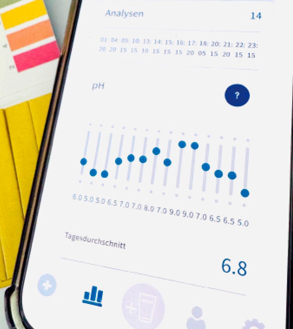 Abb. 5: Die Gratis-Smartphone-App „Uroli“ funktioniert ohne individuelle Registrierung. Der Harn-pH kann mit kostengünstigen Universal- Lackmuspapier-Teststreifen gemessen und in der App durch Antippen der entsprechenden Farbe dokumentiert werden. Zielbereiche können individuell festgelegt und die Messwerte übersichtlich dargestellt werden, auch für die Trinkmenge. Rot eingekreist ist ein ehrgeiziges Harn-pH-Tagesprofil, das in Wirklichkeit nur bei sehr großer Trinkmenge oder Pollakisurie erreicht werden könnte