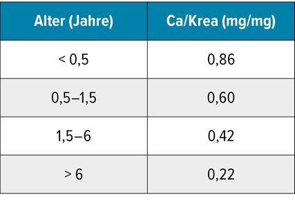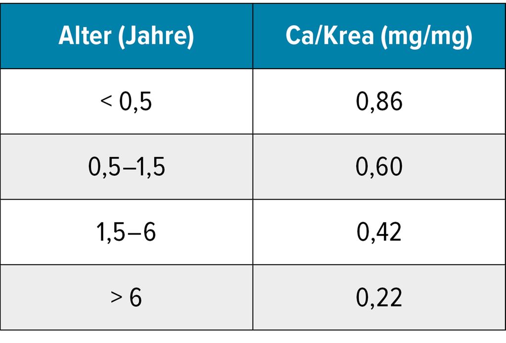 Tab. 1: Der Kalzium/Kreatinin-Quotient (Ca/Krea) im Spontanharn ist altersabhängig; höhere Werte sind bei kleineren Kindern physiologisch