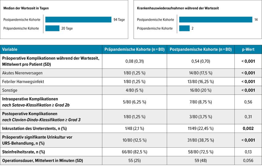 In einer retrospektiven Vergleichsanalyse unserer Arbeitsgruppe zeigte sich, dass die Verlängerung der Wartezeit für eine definitive Ureterorenoskopie von durchschnittlich 20 auf 94 Tage mit einer signifikanten Zunahme präoperativer Komplikationen assoziiert war (Abb.1 u. Tab.1). Insbesondere traten während der Wartezeit deutlich häufiger Nierenkoliken, Harnwegsinfektionen und febrile Infektionen auf, was in einem signifikanten Anstieg der Zahl ungeplanter stationärer Wiederaufnahmen resultierte. Diese zusätzlichen Hospitalisierungen waren in der Mehrzahl der Fälle mit der Notwendigkeit einer (Re-)Platzierung einer Ureterschiene verbunden und spiegeln eine relevante Verschiebung der Krankheitslast in die präoperative Phase wider. Bemerkenswert ist dabei, dass trotz der deutlich verlängerten Wartezeiten keine Zunahme intra- oder postoperativer Komplikationen beobachtet wurde, was darauf hindeutet, dass sich die Morbidität nicht im Rahmen des Eingriffs selbst, sondern primär im zeitlichen Vorfeld der definitiven Therapie manifestiert.