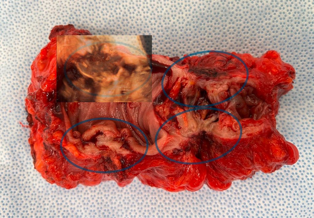 Abb. 11: Darmendometriose. Intraoperative Präparatfotografie mit halbtransparent darüberliegender 3D-sonografischer Darstellung