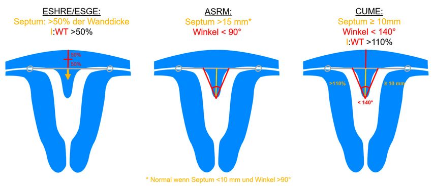 Das MRI zeigt eine vergleichbare Testgenauigkeit, ist jedoch teurer und sollte deshalb nur bei fehlender Möglichkeit zur Durchführung eines 3D-Ultraschalls, bei komplexen Fehlbildungen oder assoziierten Anomalien zum Einsatz kommen. Bei Fehlbildungen ist eine zusätzliche Nierensonografie durchzuführen. Wichtig ist eine genaue Beschreibung der Befunde, was mithilfe verschiedener Klassifikationssysteme erleichtert wird (u.a. AFS,3 Acien,4 VCUAM,5 ESHRE/ESGE,6 ASRM7), wobei am Universitätsspital Zürich üblicherweise die Einteilung nach ESHRE/ESGE verwendet wird.