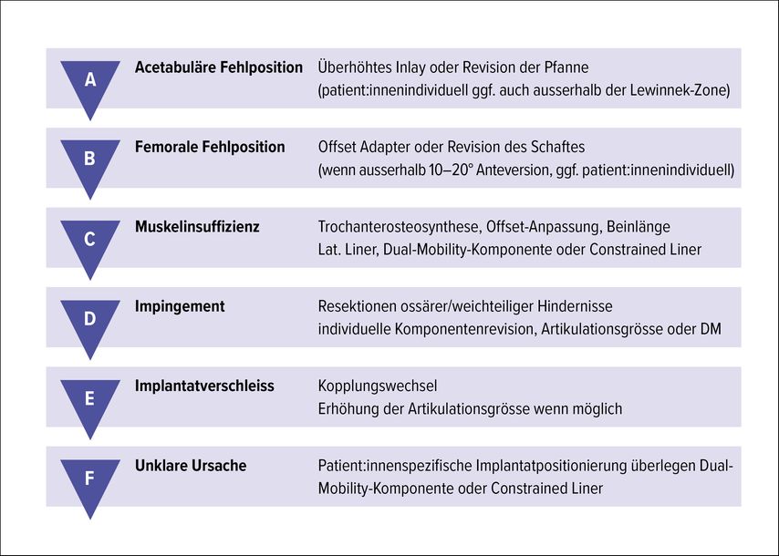 Die operative Strategie bei Instabilität nach Revisions-HTEP sollte streng ursachenorientiert und multifaktoriell erfolgen. Aufbauend auf dem Klassifikations- und Behandlungskonzept von Wera und Kollegen von 2012 erlaubt folgender strukturierter Algorithmus die differenzierte Zuordnung der Instabilitätsursache und die Auswahl jeweils angemessener Revisionsstrategien.9