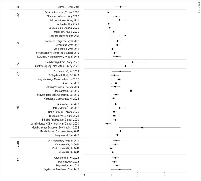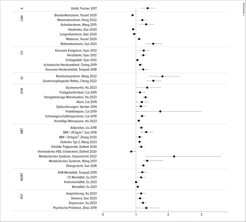 Abb. 1: Odds-Ratios der neuesten Metaanalysen zu Personen in Schichtarbeit, gruppiert nach Thema. Unfall (A), Krebs (CAN), kardiovaskuläre (CV), gastrointestinale (GI), gynäkologische (GYN), metabolische (MET), psychiatrische (PSY) Symptome oder Erkrankungen sowie Sterblichkeit (MORT). Referenzen finden sich im Text unten sowie in den Literaturangaben