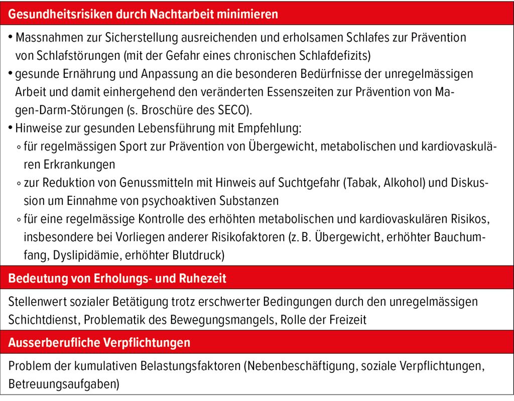 Jede Untersuchung schliesst im Falle der Eignung für Nachtarbeit eine Beratung mit ein. Die eigentliche Beratung zur Aufrechterhaltung der Gesundheit berücksichtigt die in Tabelle 2 aufgeführten Punkte.