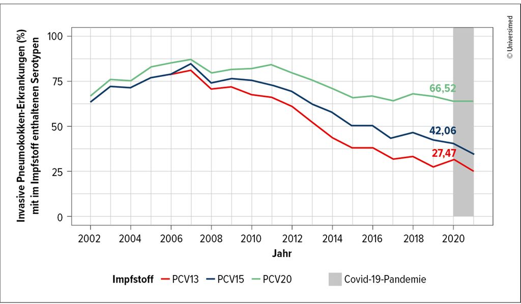 Abb. 1: Anteil (in %) von invasiven Pneumokokken-Erkrankungen bei ≥65-jährigen Personen über die Zeit (2002–2021), welche durch die Serotypen in den verschiedenen Konjugatimpfstoffen abgedeckt gewesen wären (adaptiert nach BAG-Bulletin 2024)4