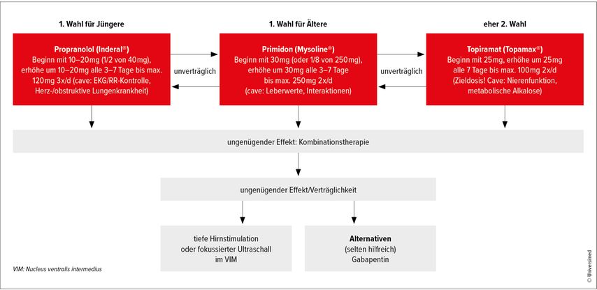 Die therapeutische Strategie orientiert sich am Ausmass der Beeinträchtigung resp. am individuellen Leidensdruck, weil meist nur symptomatische Therapieoptionen zur Verfügung stehen. Beim essenziellen Tremor kommen in der medikamentösen Erstlinientherapie Betablocker, insbesondere Propranolol, sowie Antikonvulsiva wie Primidon oder Topiramat zum Einsatz (Abb.1).24 Propranolol ist insbesondere bei Patient:innen mit Hypertonie von Vorteil und kann auch bei Bedarf eingenommen werden, während Primidon sedierend wirkt und initial einschleichend dosiert werden sollte. Nichtmedikamentös können sich Ergotherapie, Hilfsmittel oder gezielte motorische Übungen anbieten, um die Lebensqualität zu verbessern.